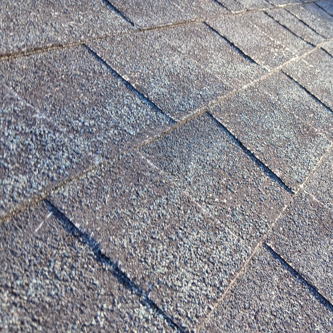 - Exposed Fiberglass Matting: The fiberglass mat below the granules is not designed to withstand UV radiation. Hail impacts can fracture the asphalt layer and exposure the fiberglass matting beneath, which will deteriorate it and provide an access point for water infiltration.
