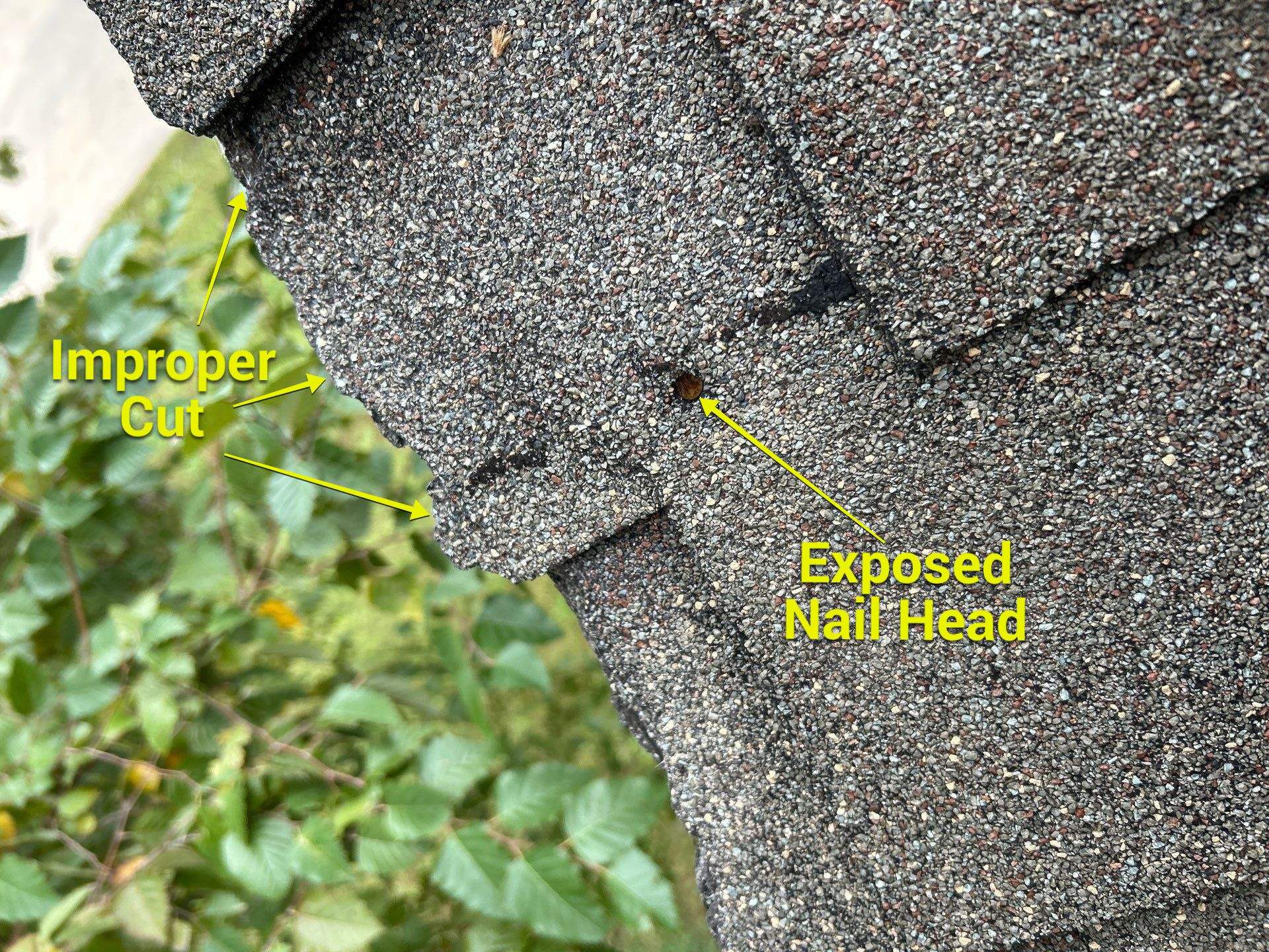 - Exposed Nail Heads: Because shingle courses overlap the nail zone of the course below, a properly installed roof should not have exposed nail heads.