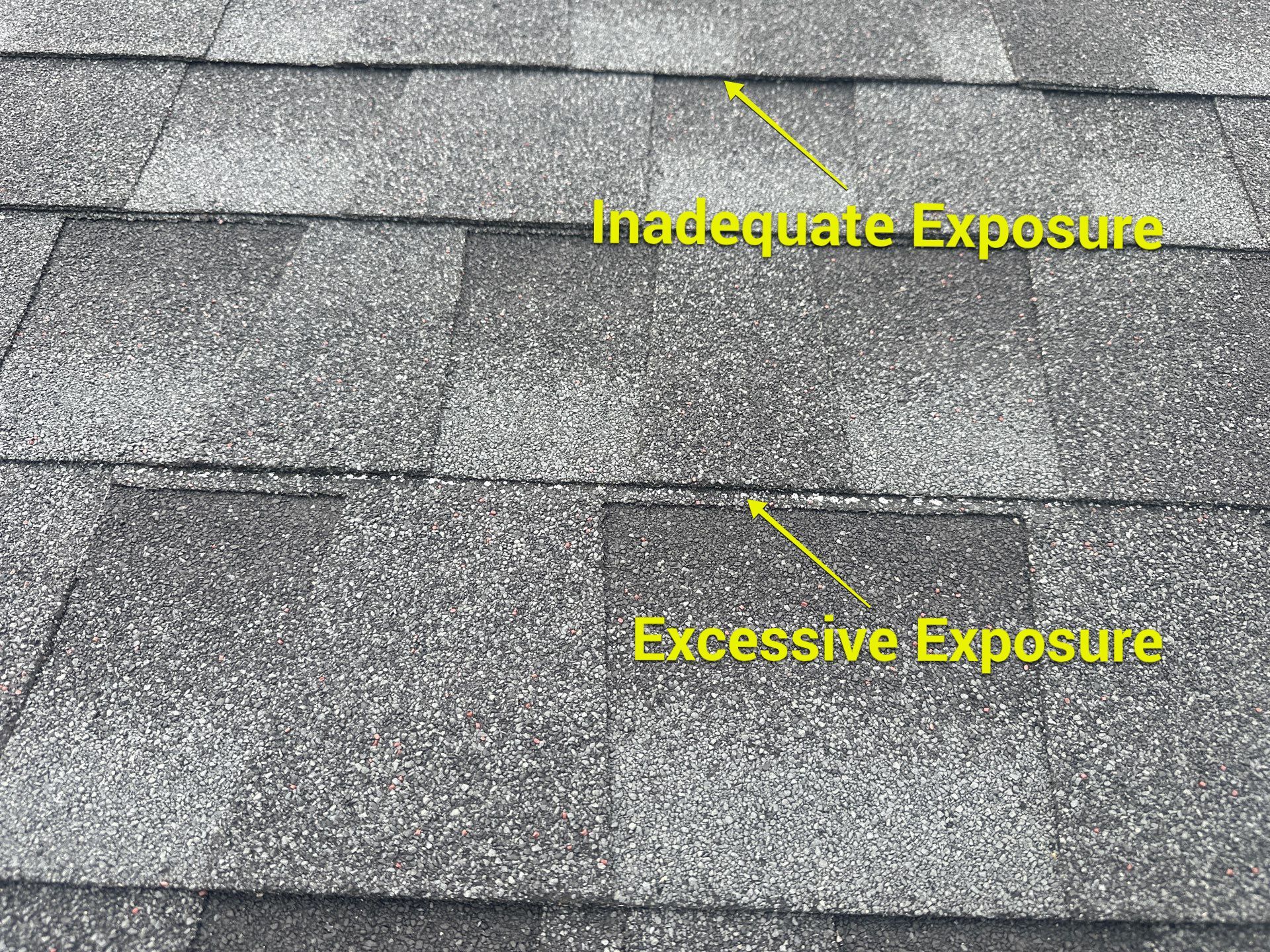 - Incorrect Exposure: Exposure refers to the amount of the shingle that is exposed to the elements, not overlapped or obstructed. GAF’s Timberline HDZ and ASII shingles, for example, have a specified exposure of 5 5/8”. One shingle installed with improper exposure will cause the succeeding course to have improper exposure, which can create vulnerabilities in the slope.
