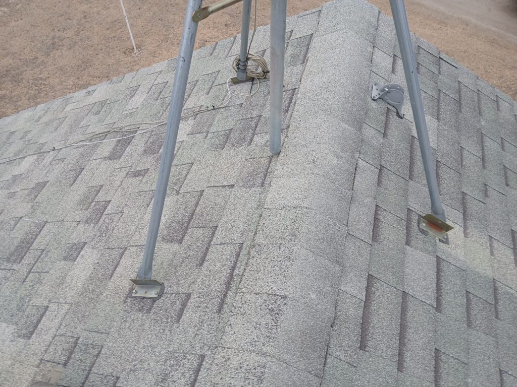 shingles and decking with lag screws. J-mounts are the most common mounting method on residential roofs because they’re simple, compact, and afford flexibility with the hardware’s facing angle. However, they typically rely on six screws and a combination of sealant and caulk to stay watertight. - Tripod Mounts: A tripod mount uses three metal legs to support a vertical mast. Each leg is fastened to the roof separately, spreading the load across each plate rather than a single plate. Tripods are typically used for larger dishes or antennas that are mounted near the ridge. They provide better stability than J-Mounts while introducing more roof penetrations.